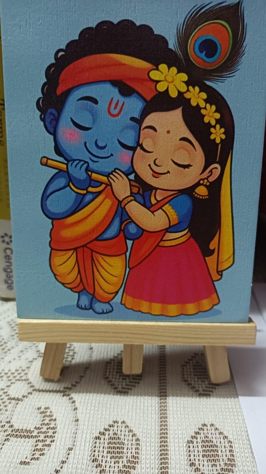 Introducing our exquisite Cute Radha Krishna Wood Print with Easel Stand, a beautiful addition to any home or office. This stunning piece of art showcases the divine love of Radha and Krishna, crafted with precision and attention to detail on high-quality wood. The included easel stand allows for effortless display, making it a perfect gift or decoration for devotees and art lovers alike. Bring a touch of spirituality and elegance to your space with this charming wood print.