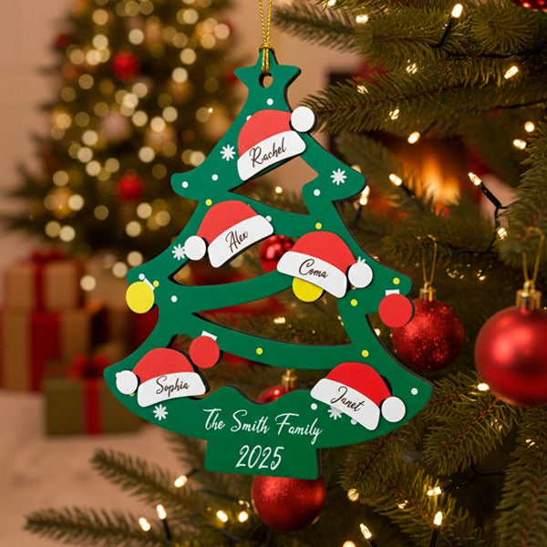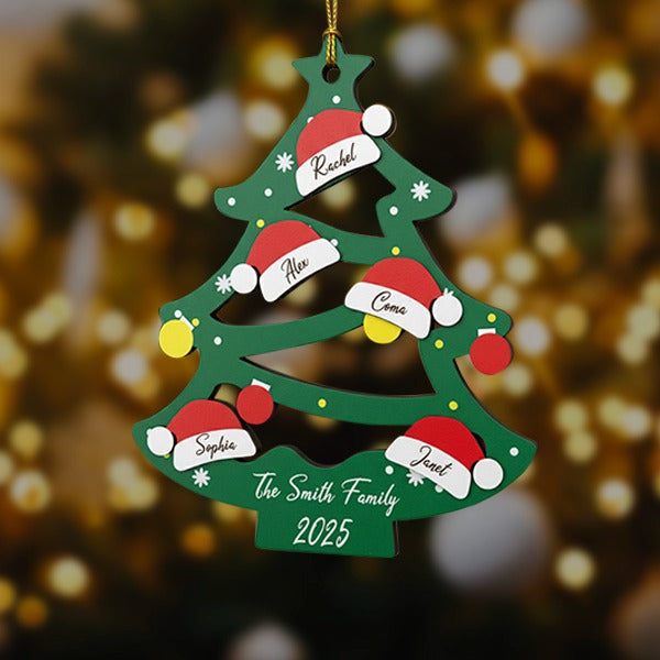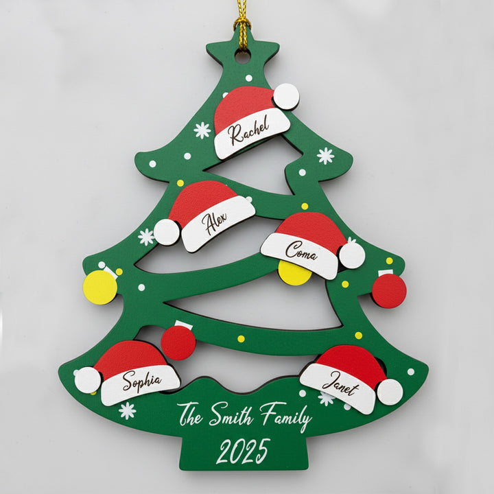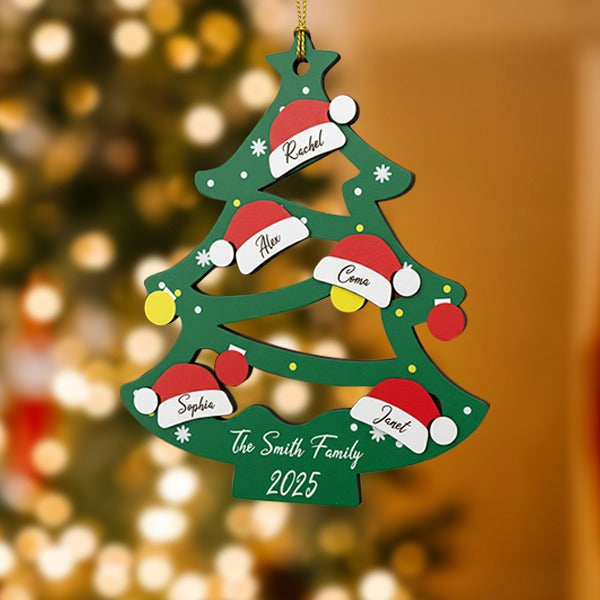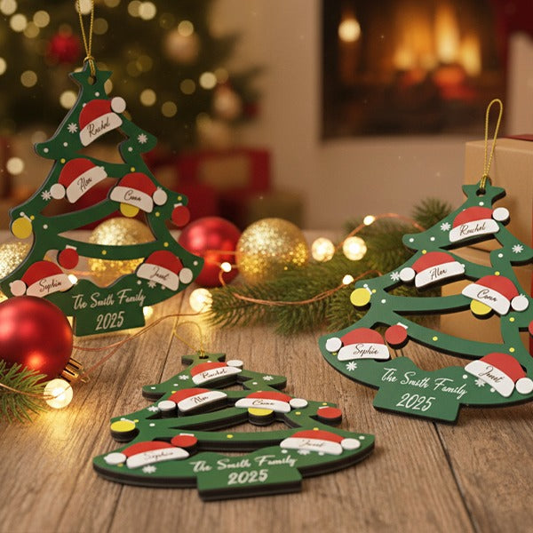Each ornament is beautifully crafted from premium wood and shaped like a Christmas tree — featuring cute little Santa hats with your loved ones’ names printed on them. The hats are carefully placed on layered branches, giving the piece a charming 3D look that stands out on any Christmas tree or wall. 🎅✨