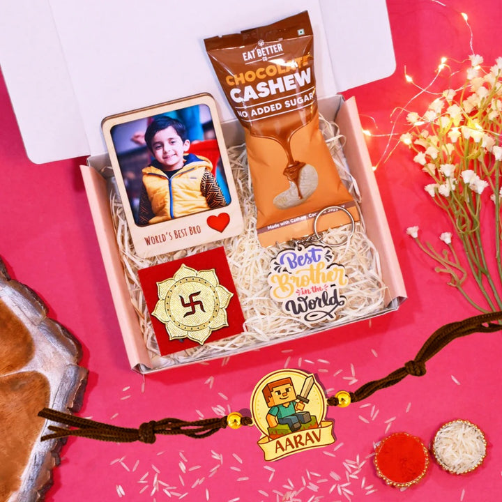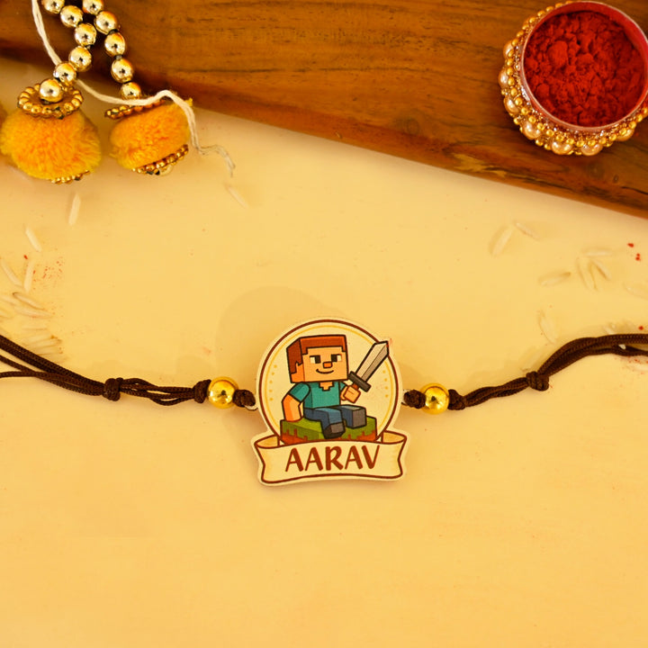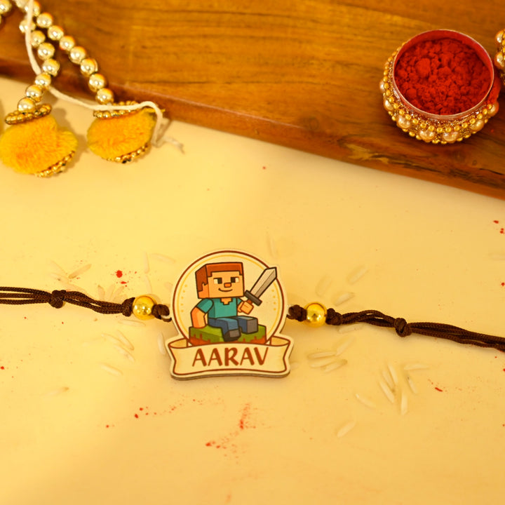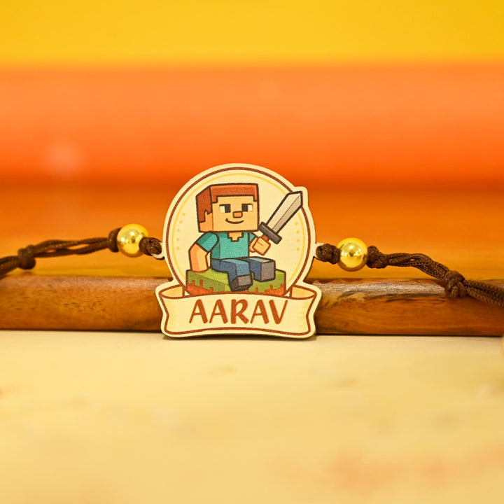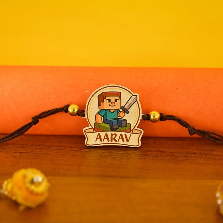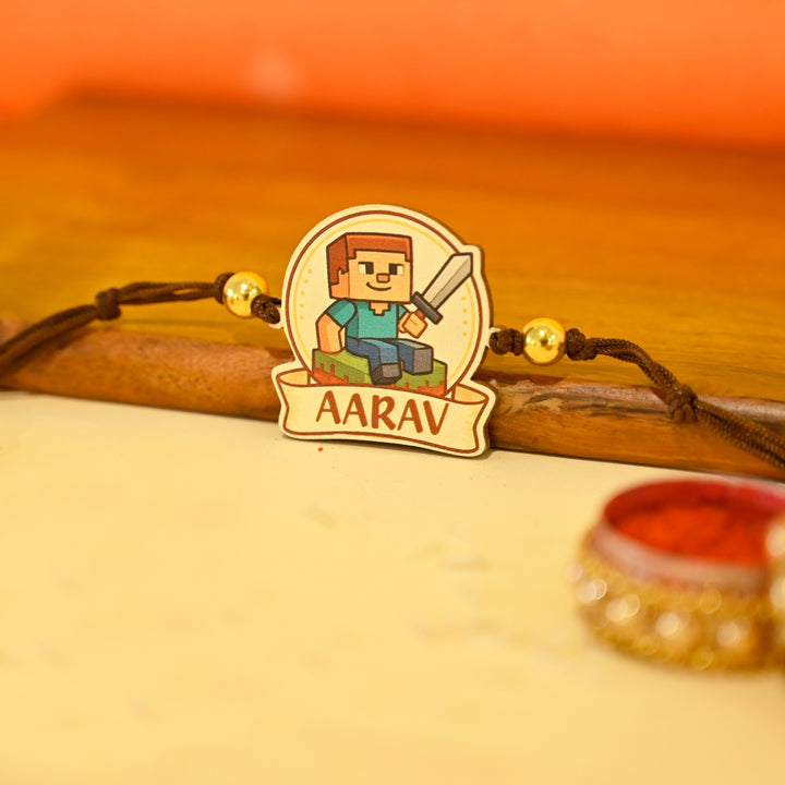 This Raksha Bandhan, give your sibling a gift that's as unique as your bond. Our Personalised Minecraft Wooden Rakhi is a thoughtful blend of traditional values and modern gaming charm. Made from high-quality wood, this exclusive rakhi features a custom- name print Minecraft design that celebrates your shared love for the game. With a personalised touch, it becomes a heartfelt symbol of affection and protection. Make this Raksha Bandhan memorable with a gift that's truly one-of-a-kind. Order now and craft unforgettable memories!