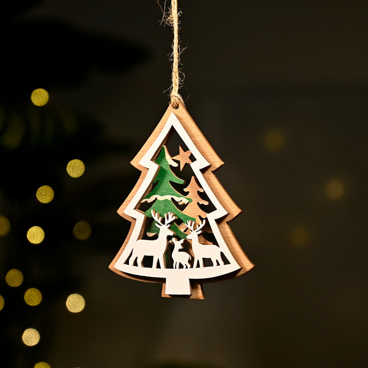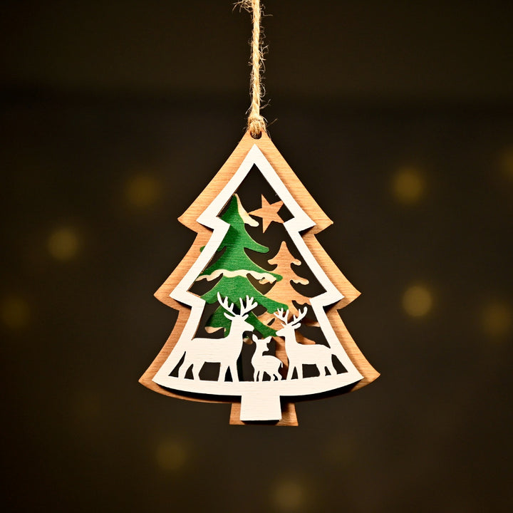 Celebrate the season with this beautifully handcrafted tree-shaped ornament, made of layered wood for a timeless festive charm. Designed in two elegant layers, the back layer has a natural wooden feel, while the front layer features a reindeer and trees in soft icy colors, creating a magical winter wonderland look.